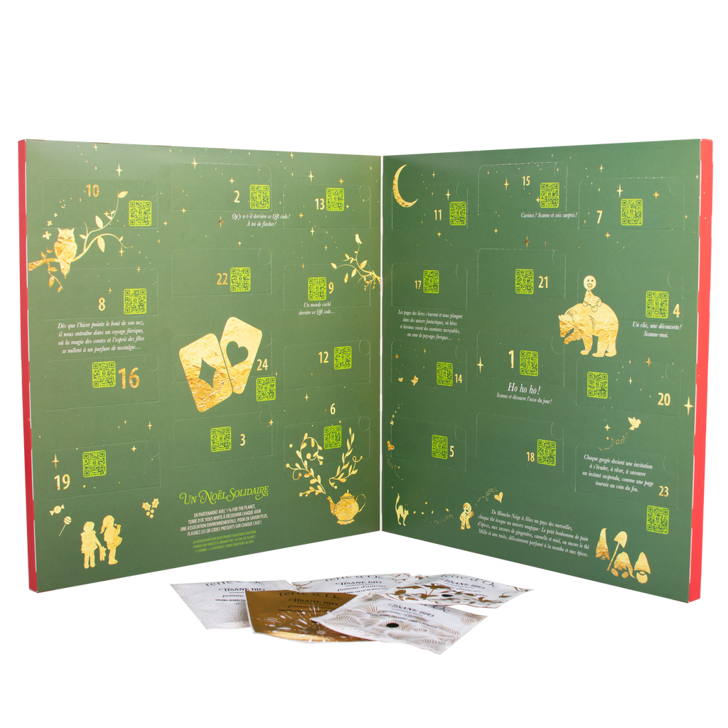 A solidarity Advent calendar to wait until Christmas. Every day, discover an organic tea or herbal tea with flavors inspired by the stories of yesteryear, between warm spices, fruity notes and gourmet infusions. Like a true storybook, this Advent calendar also holds a beautiful solidarity surprise: the discovery of an environmental association to which you can contribute, thanks to a donation doubled by our commitment to 1% for the Planet. A unique way to wait for the holidays, between gluttony, magic and generosity.